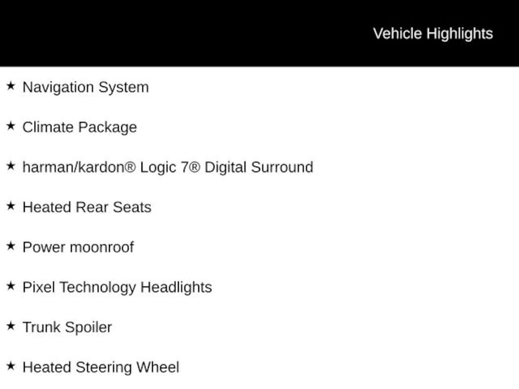 Apple CarPlay, Climate Package, harman/kardon® Logic 7® Digital Surround, Heated front seats, Heated Rear Seats, Heated Steering Wheel, Navigation System, Pixel Technology Headlights, Power moonroof, Trunk Spoiler, Wheels: 20" 5-Double Spoke Black Alloy.