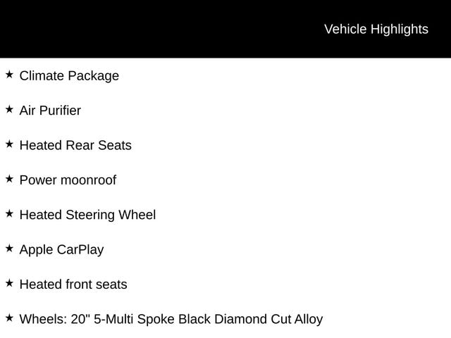 Elevate your driving experience with an array of premium features, including - Air Purifier, Heated Rear Seats, Power Moonroof, Apple CarPlay, Heated Steering Wheel, Heated Front Seats, and Stunning 20" 5-Multi Spoke Black Diamond Cut Alloy Wheels.