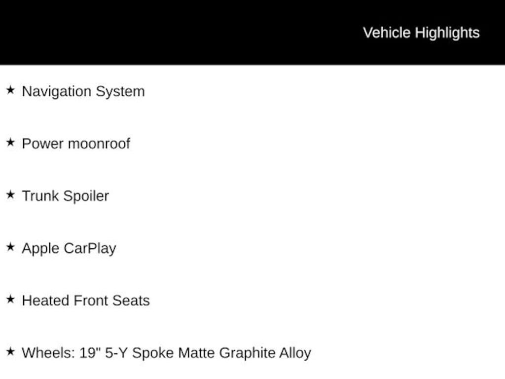Apple CarPlay, Heated Front Seats, Navigation System, Power moonroof, Trunk Spoiler, Wheels: 19" 5-Y Spoke Matte Graphite Alloy.