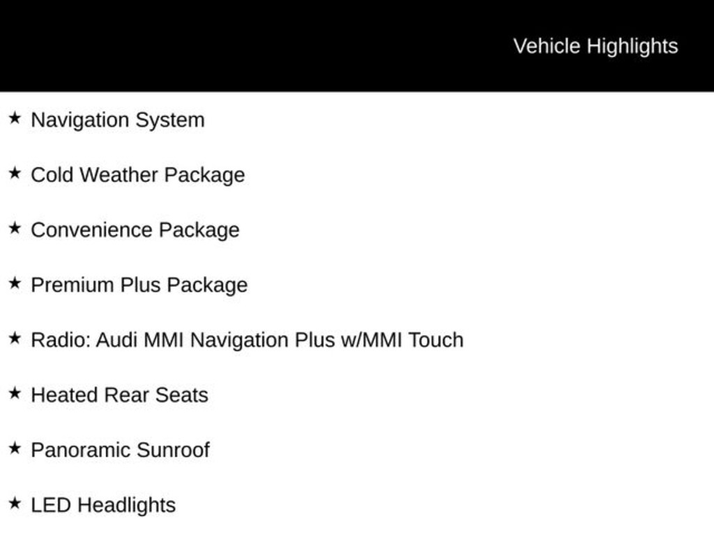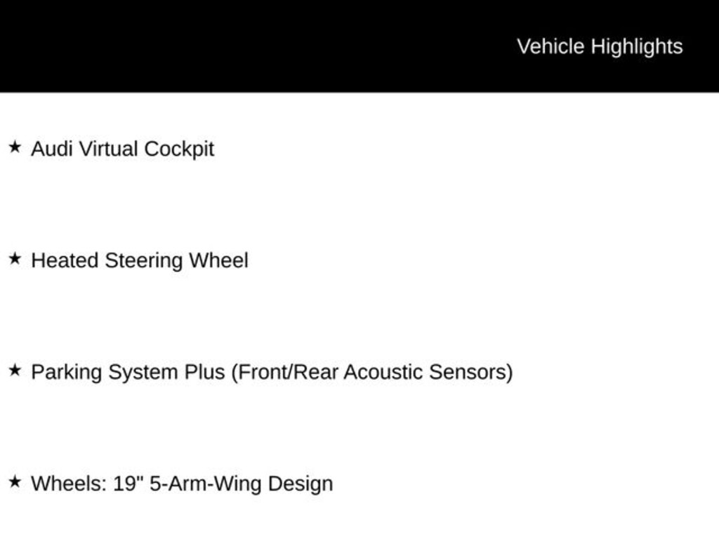 Audi Virtual Cockpit, Cold Weather Package, Convenience Package, Heated Rear Seats, Heated Steering Wheel, LED Headlights, Navigation System, Panoramic Sunroof, Parking System Plus (Front/Rear Acoustic Sensors), Premium Plus Package, Radio: Audi MMI Navigation Plus w/MMI Touch, Wheels: 19" 5-Arm-Wing Design.