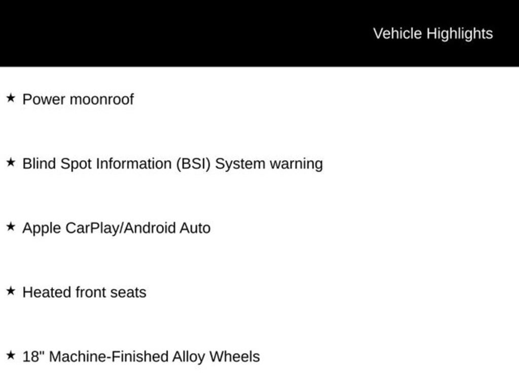 18" Machine-Finished Alloy Wheels, Apple CarPlay/Android Auto, Blind Spot Information (BSI) System warning, Heated front seats, Power moonroof.