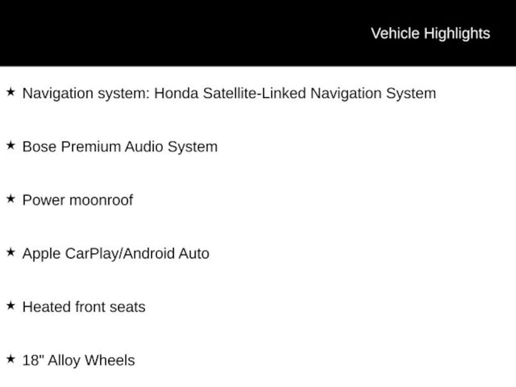 18" Alloy Wheels, Apple CarPlay/Android Auto, Bose Premium Audio System, Heated front seats, Navigation system: Honda Satellite-Linked Navigation System, Power moonroof.