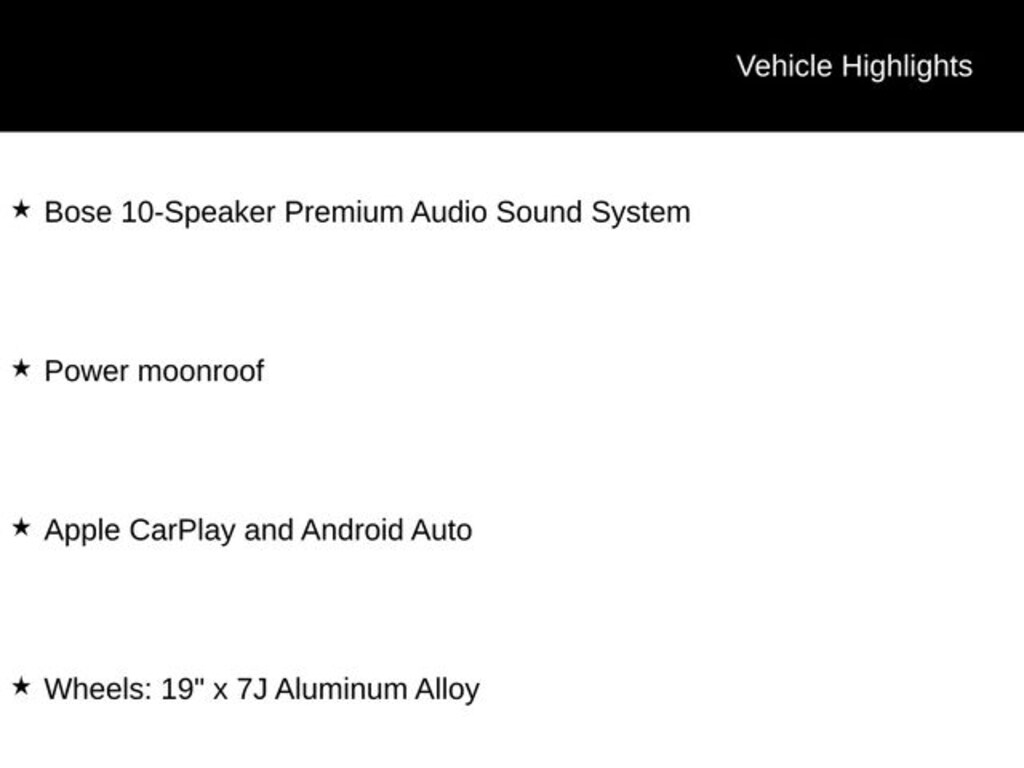 Apple CarPlay and Android Auto, Bose 10-Speaker Premium Audio Sound System, Power moonroof, Wheels: 19" x 7J Aluminum Alloy.
