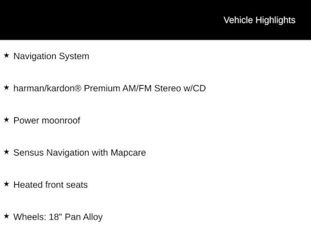 harman/kardon® Premium AM/FM Stereo w/CD, Heated front seats, Navigation System, Power moonroof, Sensus Navigation with Mapcare, Wheels: 18" Pan Alloy.