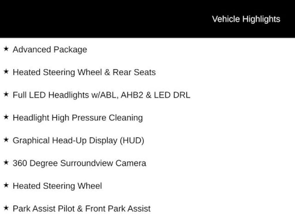 360 Degree Surroundview Camera, Advanced Package, Apple CarPlay/Android Auto, Full LED Headlights w/ABL, AHB2 & LED DRL, Graphical Head-Up Display (HUD), Headlight High Pressure Cleaning, Heated front seats, Heated Rear Seats, Outer Positions, Heated Steering Wheel, Heated Steering Wheel & Rear Seats, Park Assist Pilot & Front Park Assist.