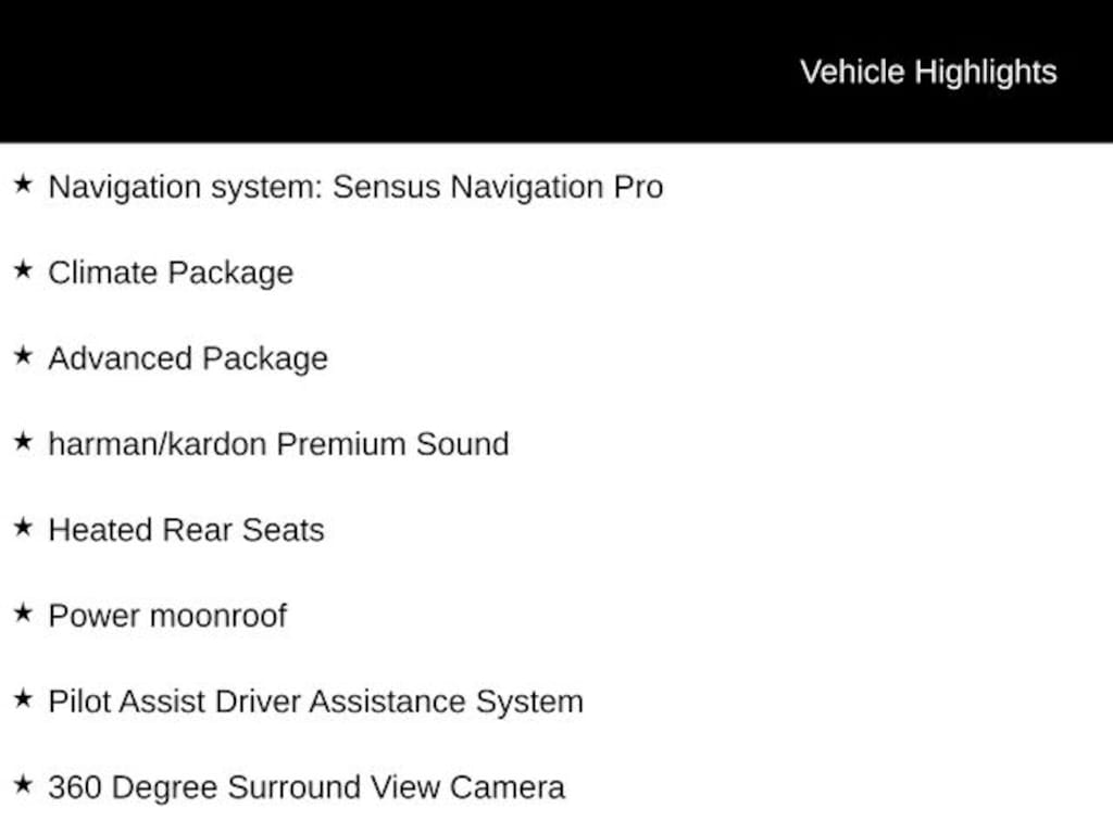 360 Degree Surround View Camera, Advanced Package, Apple CarPlay/Android Auto, Climate Package, harman/kardon Premium Sound, Heated Rear Seats, Heated Steering Wheel, Navigation system: Sensus Navigation Pro, Park Assist Pilot, Pilot Assist Driver Assistance System, Power moonroof, Wheels: 19" 5-Double Spoke Black Diamond Cut Alloy.